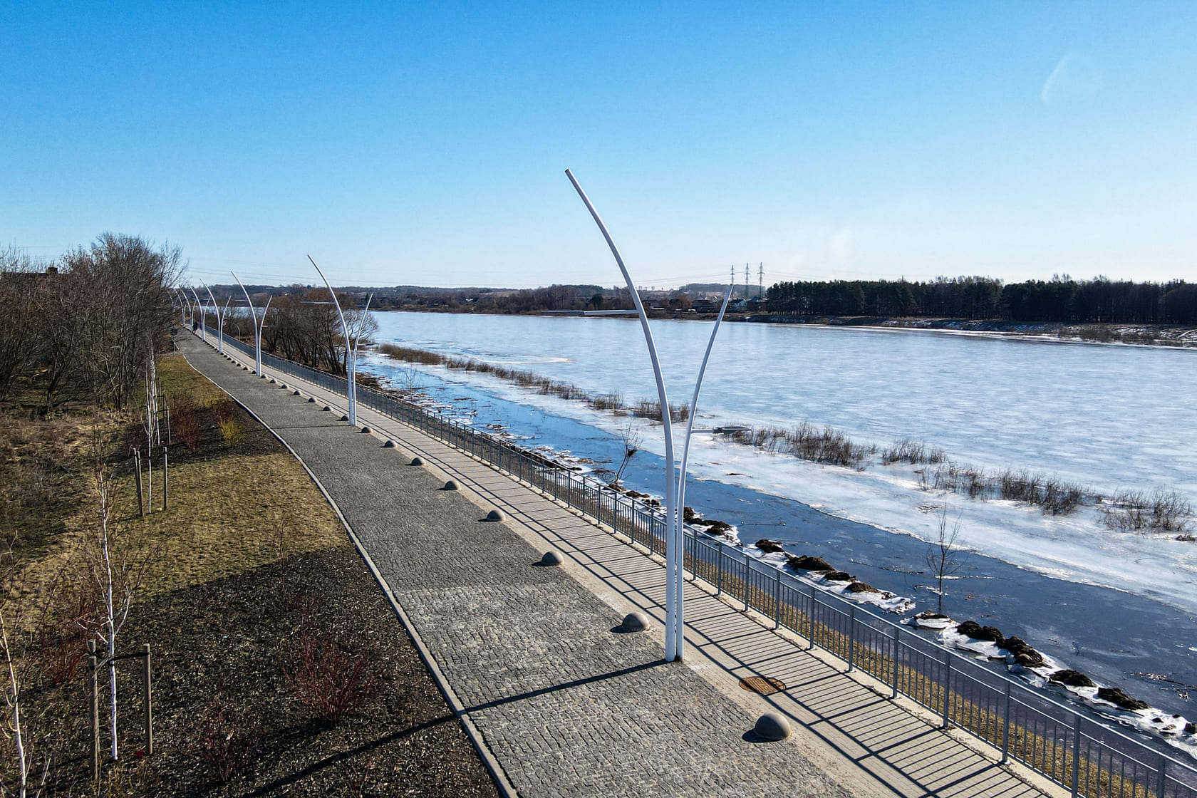 The 1.2-kilometer-long promenade has a pedestrian walkway and a cycle path. Both granite chisels and concrete cobblestones were used for the paving. Rainwater sewerage system installed. The edge of the promenade facing the Daugava is equipped with a safety barrier. During the construction of the support wall, the stone slope was restored. There are benches and exercise equipment in the walking area. Interesting design lighting fixtures attract attention. The area is landscaped and landscaped.